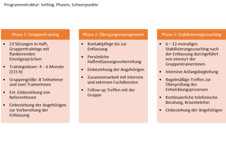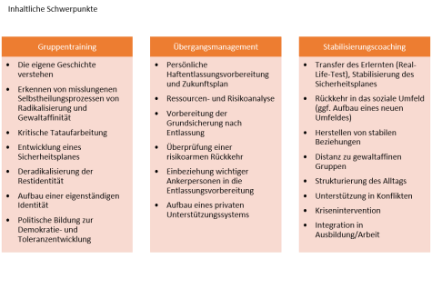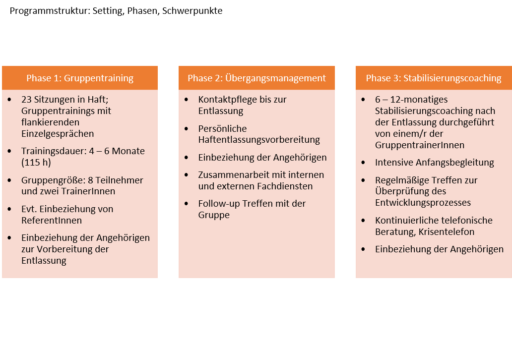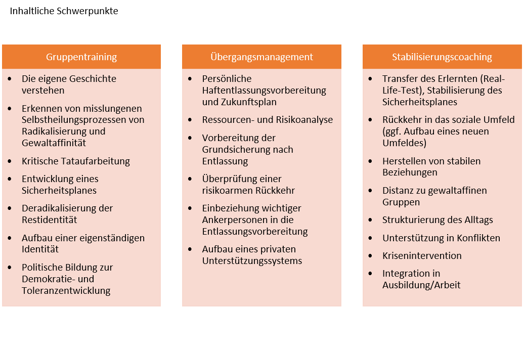 Das Stabilisierungscoaching – der Re- al-Life-Test: Ideologisch motivierte Denkmuster und gewaltbereites Verhalten sind tief in der Persönlichkeit der Jugendlichen verwurzelt. Für eine Ablösung brauchen sie Zeit, Unterstützung und vertrauensvolle Beziehungen. Bestimmte Wirkfaktoren haben sich hierbei als stabilisierend bzw. grundlegend erwiesen, dazu zählen u.a. die Fähigkeit zu Empathie, zur Selbstreflexion und zur Verbalisierung des eigenen Denkens, die Fähigkeit, Eigenverantwortung zu übernehmen und tragfähige Beziehungen einzugehen, und die Herausbildung eines stabilen Selbstwertgefühls. Unterstützend wirken ein strukturierter Tagesablauf, das Einbeziehen des sozialen Umfeldes, eine vorgehaltene Krisenintervention und Unterstützung bei Konfliktklärungen, der kontrollierte Umgang mit Drogen und Alkohol sowie und besonders die Distanz zu gewaltaffinen und extremen Gruppen. Nach der Entlassung liegt der Schwerpunkt daher in der begleiteten Rückkehr in das soziale Umfeld und der Strukturierung des Alltags, dem Transfer des im Training Erlernten (Real-Life-Test), dem Herstellen von stabilen sozialen Beziehungen und der Integration in Ausbildung oder Arbeit. Gerade bei Misserfolgen oder Frustrationserlebnissen ist die Gefahr groß, sich wieder den von vor der Haft vertrauten Personen zuzuwenden und in die alten Strukturen abzugleiten. Die Trainerin/der Trainer greift hier unterstützend ein und fungiert als personelle Erinnerung, um den in der Haft initiierten Prozess der Distanzierung und die Selbstkontrolle in Konfliktsituationen aufrecht zu halten bzw. neu zu aktivieren. Folgende Themen haben sich für diese Phase als zentral erwiesen:
